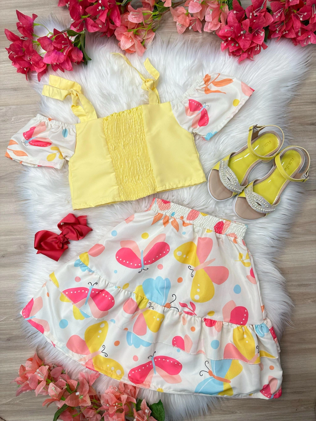 🦋 Surpreenda e encante sua pequena com o Conjunto Meninas Blusa Amarela e Saia Borboletas Coloridas (0135AM)!